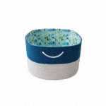 This handwoven blue and white cotton rope basket features a fun dinosaur print lining. Perfect for organizing toys, clothes, or nursery items, it’s sturdy, stylish, and includes handles for easy carrying. A delightful way to keep kids’ rooms tidy!