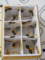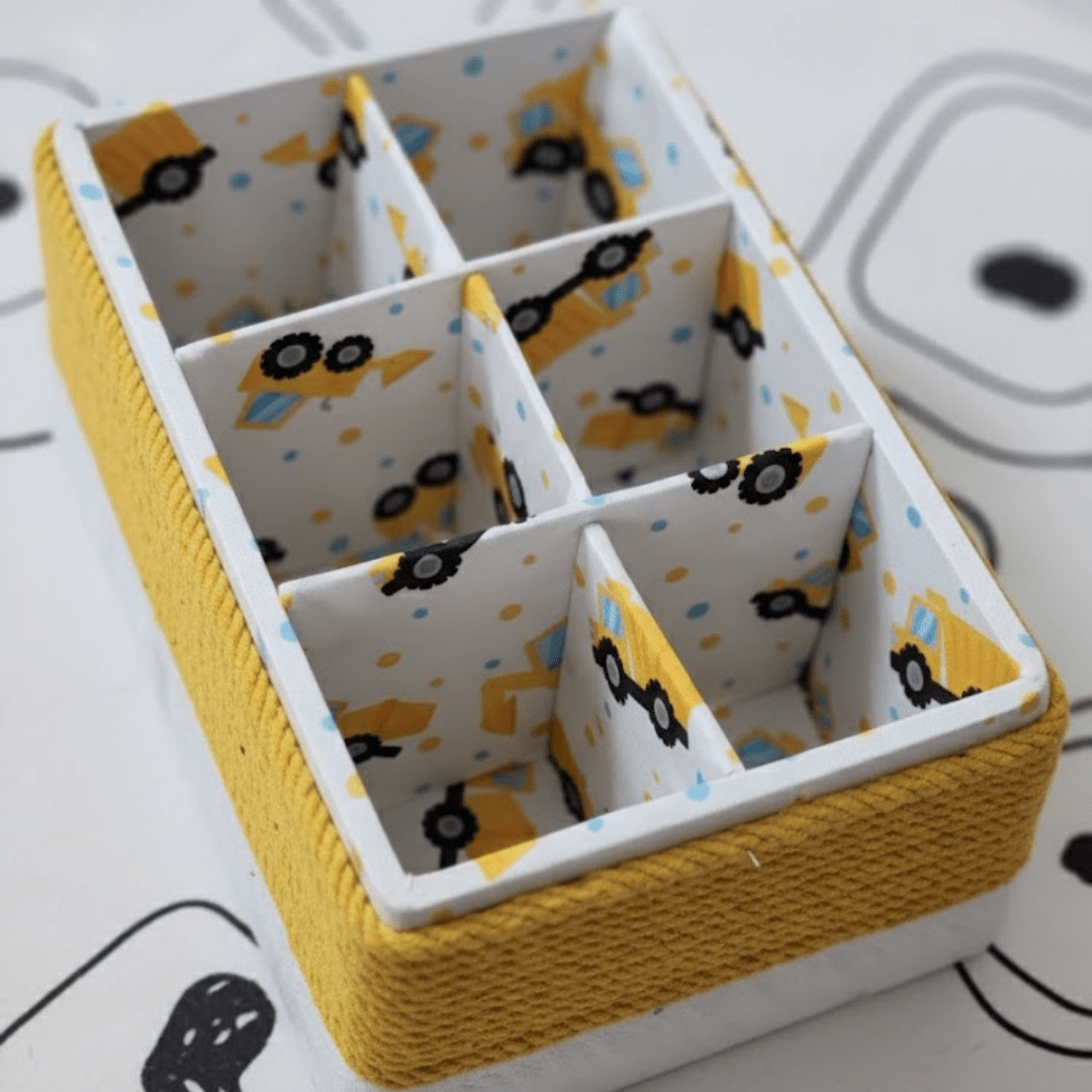 This charming and sturdy 6-compartment storage box is the perfect solution for organizing children’s essentials. This multipurpose box is ideal for keeping small toys, stationery, craft supplies, or miscellaneous items neatly contained in one place. It features an appealing design with a yellow wool yarn-wrapped exterior edge and an internal print of construction vehicles (like excavators) inside the compartments.