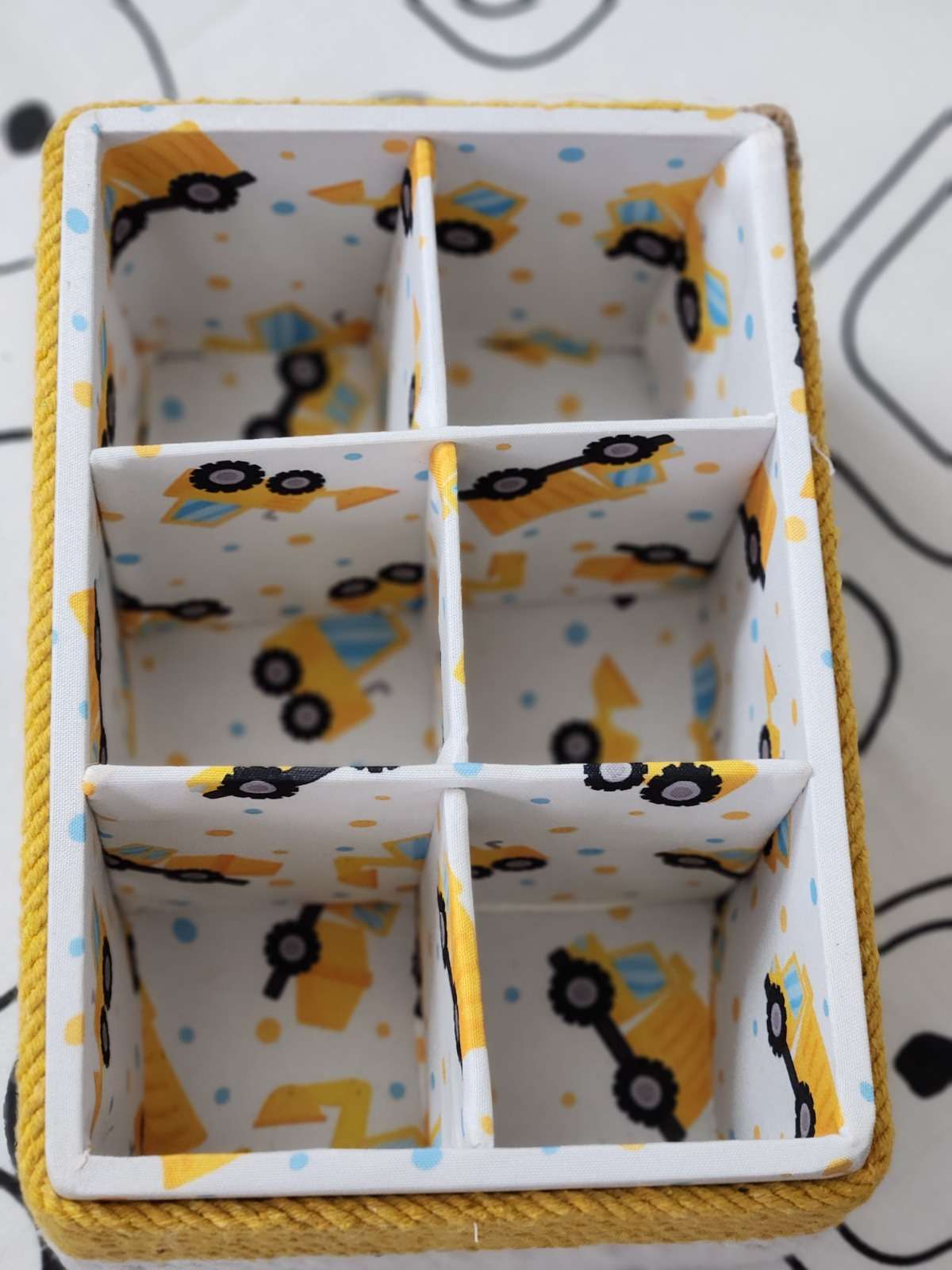 A 6-compartment storage box for children. Ideal for organizing toys, stationery, and small items. Features an attractive design with a yellow wool yarn wrap and construction vehicle print inside the sections. A fun and durable organizer for your child’s room.