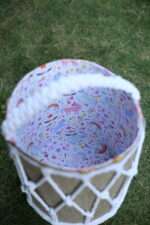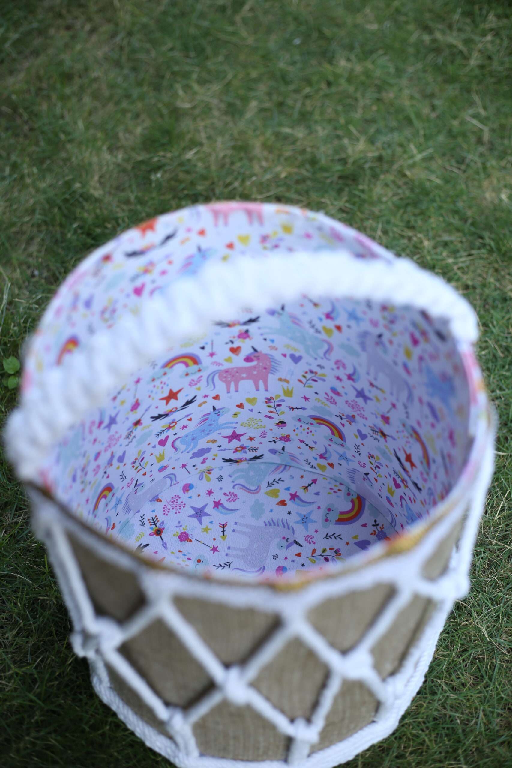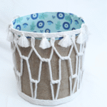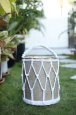 - Rustic Jute & Macrame: The basket’s body is made from natural jute fabric, overlaid with intricate white cotton macrame knotting, giving it a stylish, textured look.