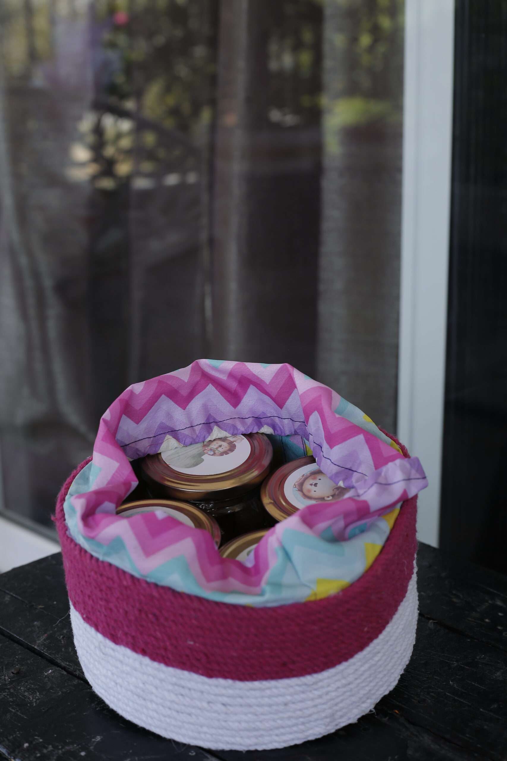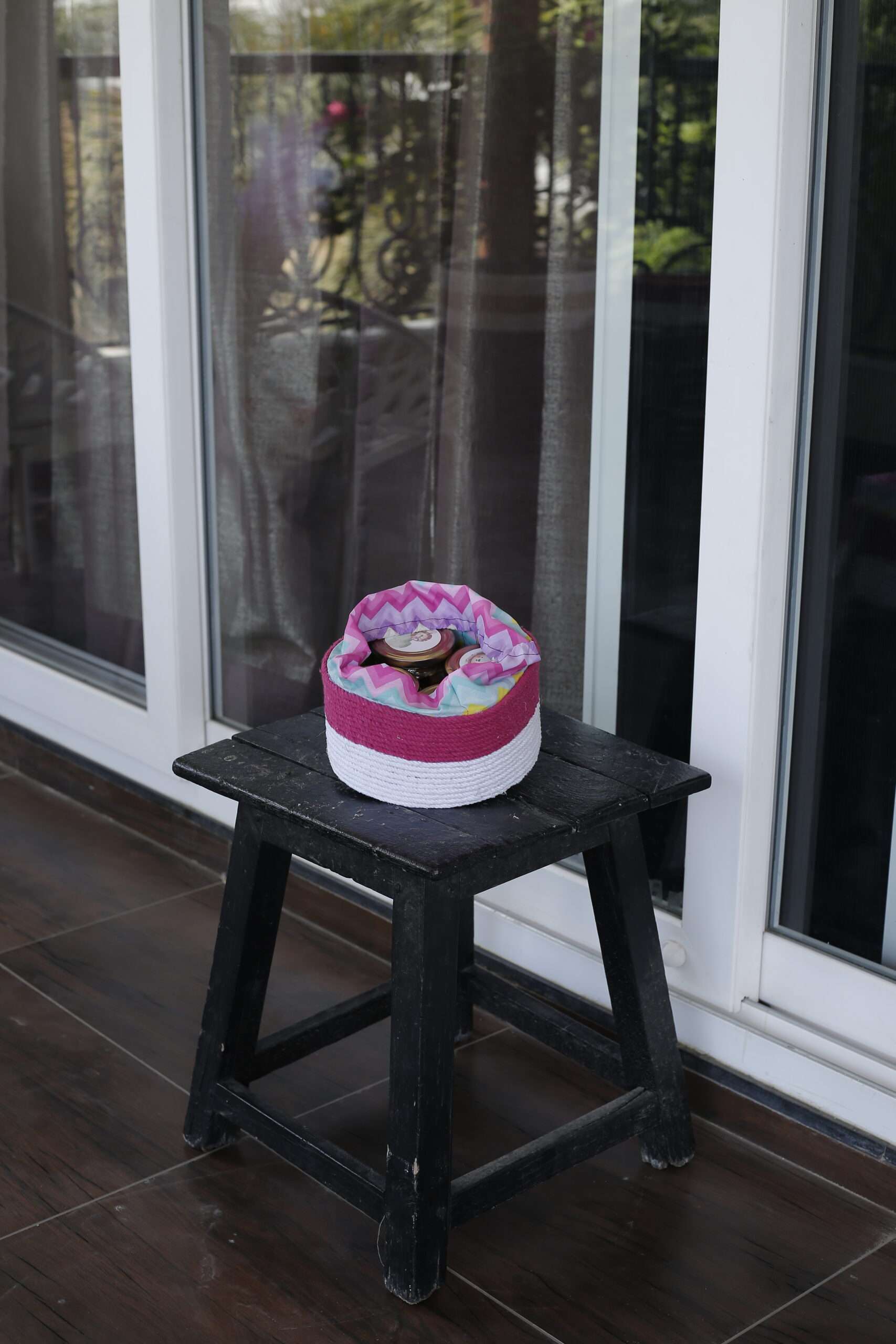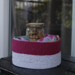 A charming and practical piece of home decor. This sturdy, two-toned rope basket is hand-coiled with thick rope—a vibrant deep pink on top and a clean white for the base—perfect for adding a pop of color to any space. Here, it’s shown holding a glass jar of fresh-baked cookies, making it an ideal choice for kitchen storage, a housewarming gift, or a unique way to present treats. The blurred background suggests a sunny balcony or window view, highlighting the contrast between rustic craft and urban life.