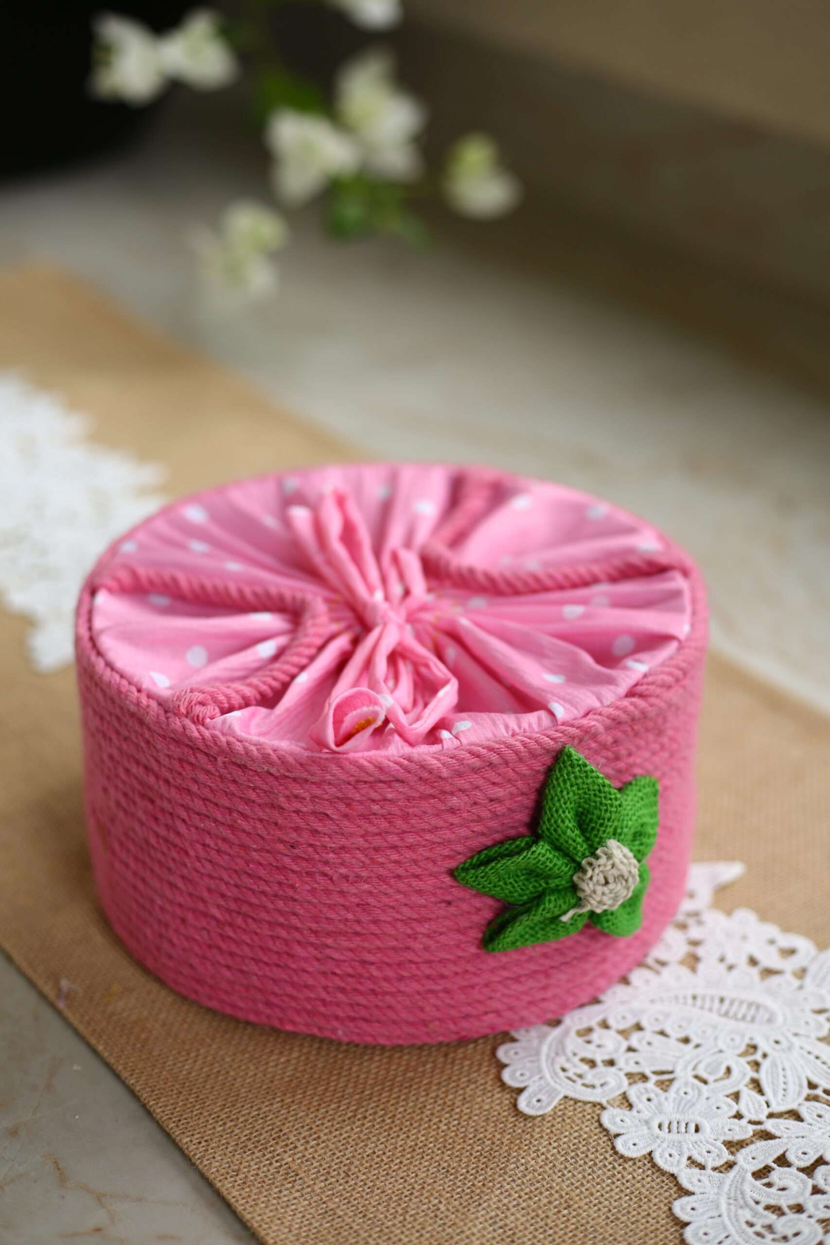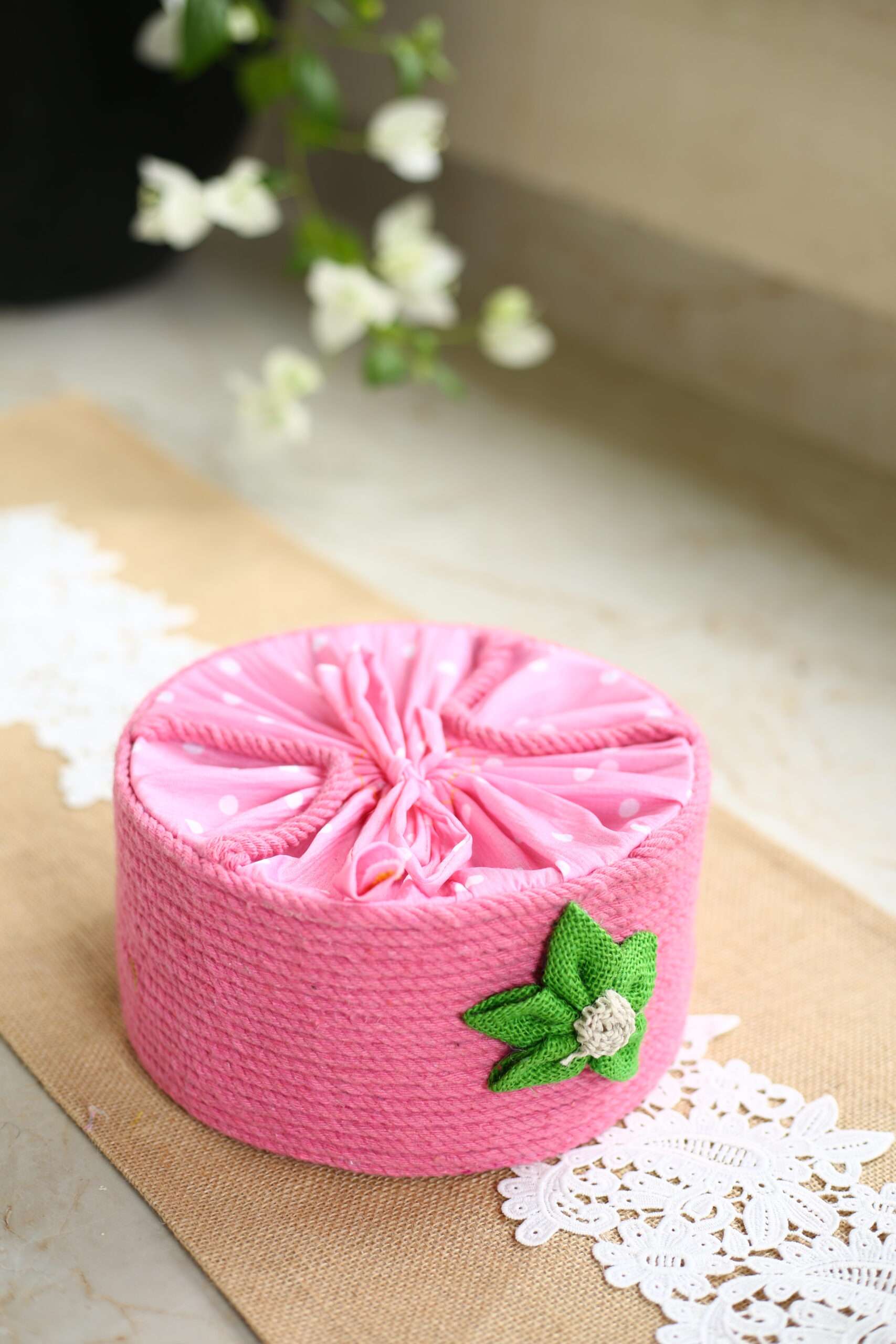 - Premium Jute Construction: The body of the box is meticulously wrapped in vibrant, high-quality pink jute thread, giving it a beautiful texture and robust structure.