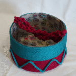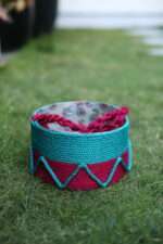 This handcrafted storage basket is made from luxurious, durable resham rope (7×4 inches). It features a stylish dual-tone design in Teal/Turquoise and Deep Pink/Magenta with unique zigzag detailing. Perfect for organizing small items or as a decorative accent piec
