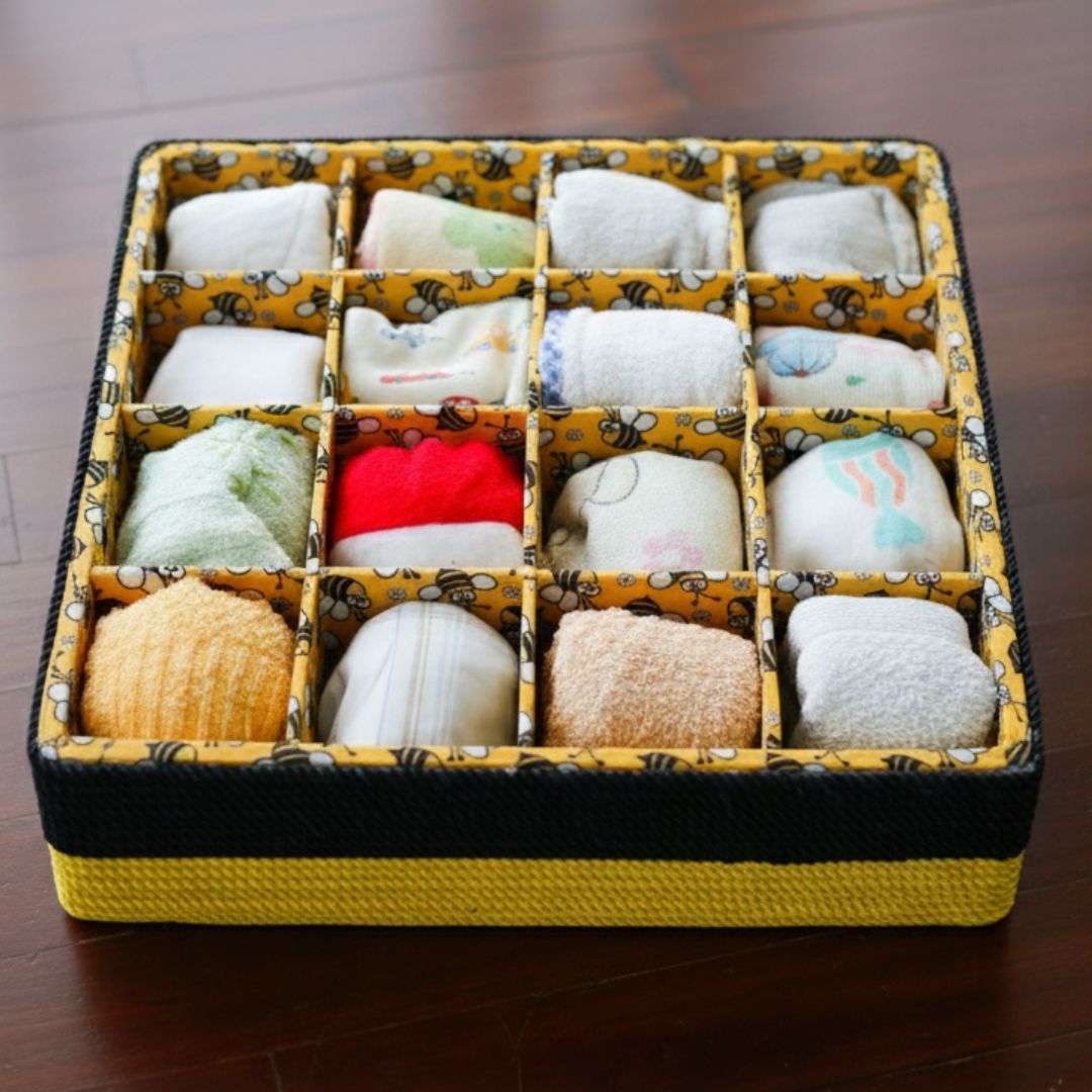 A 16-section organiser crafted from premium resham rope, designed for neatly sorting socks, accessories, and wardrobe essentials. Size: 12 x 12 x 3 inches.