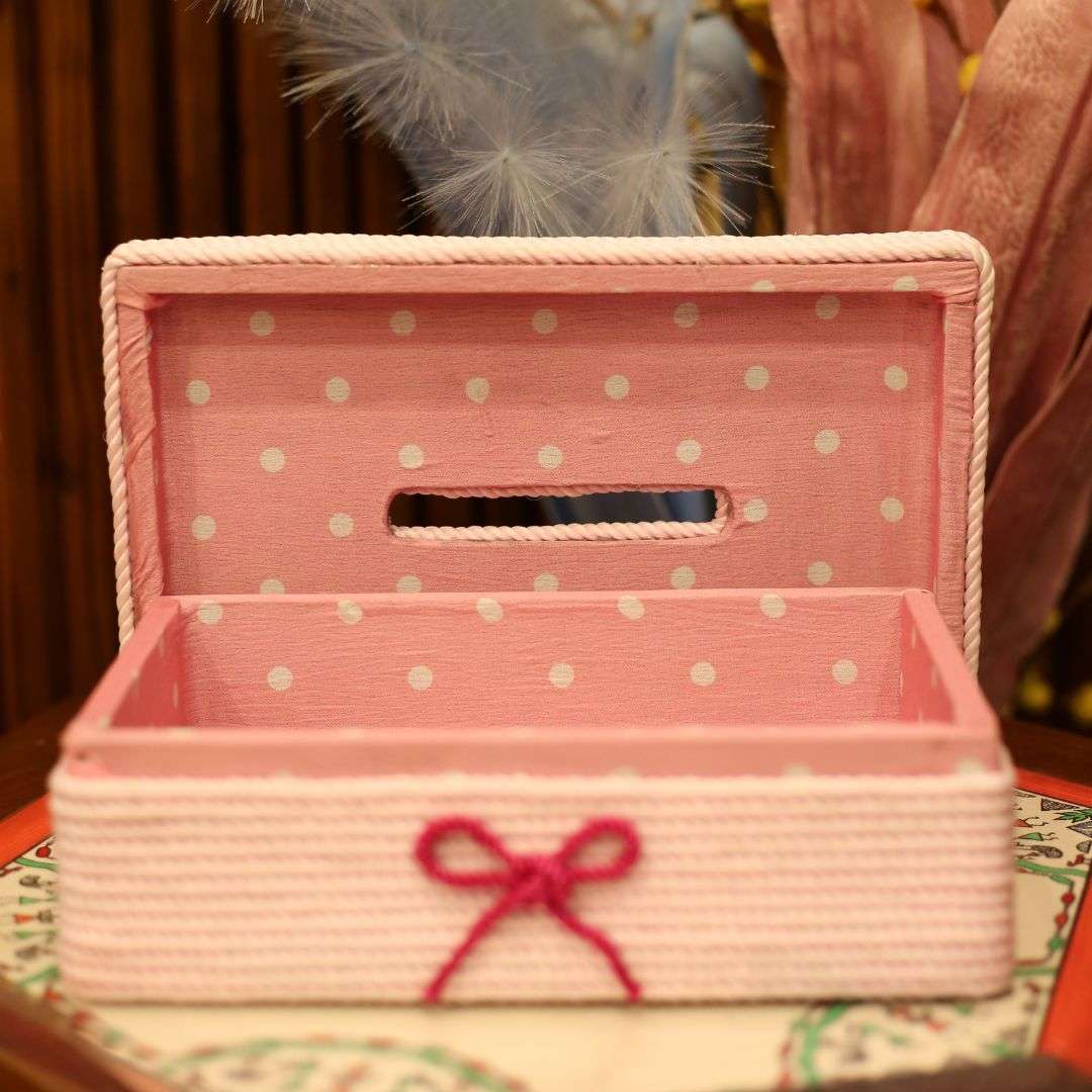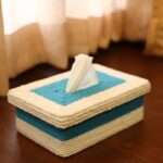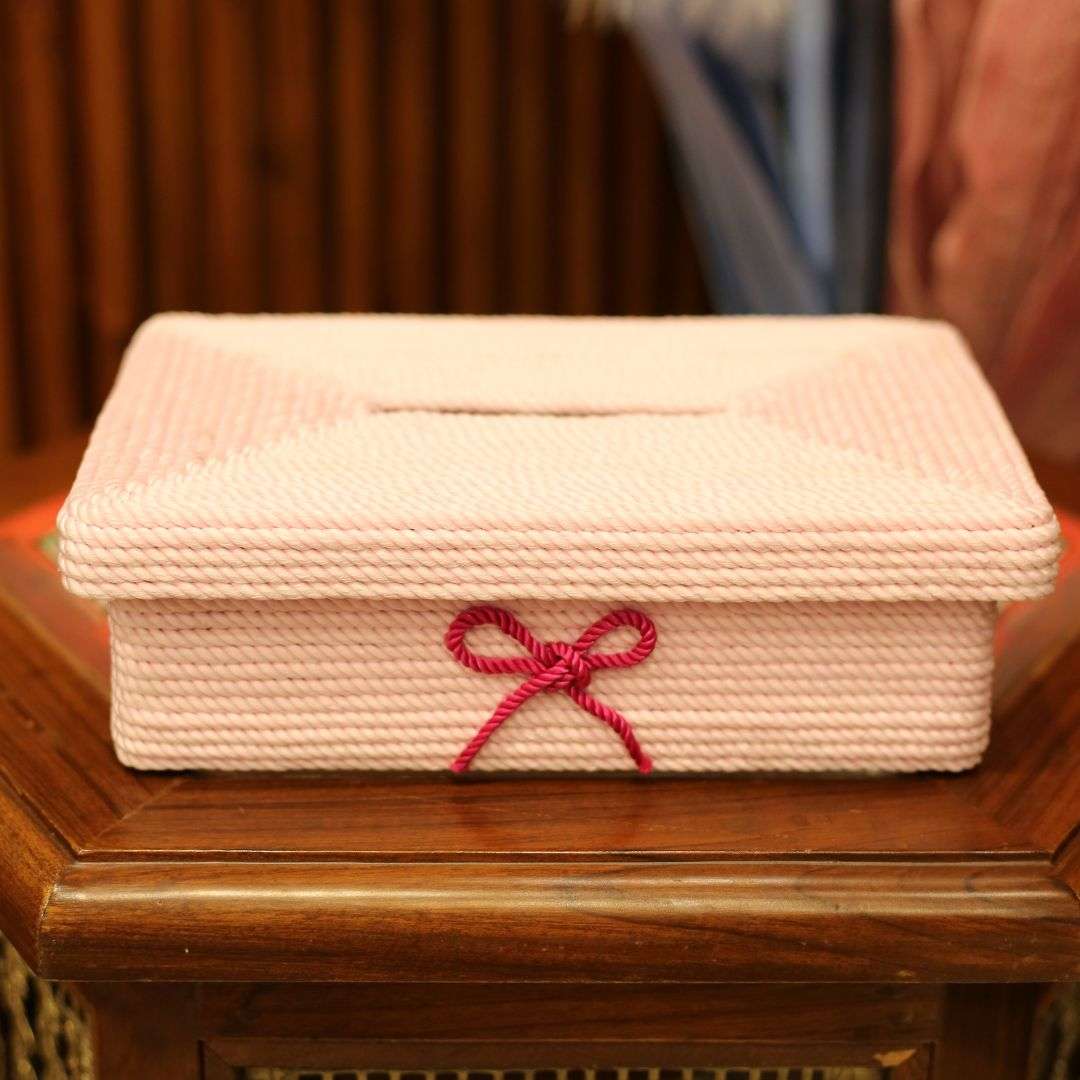 A handcrafted tissue box cover made from pure cotton jute rope, designed to add natural texture and elegance to your space. Size: 9.5 x 6 x 3 inches.