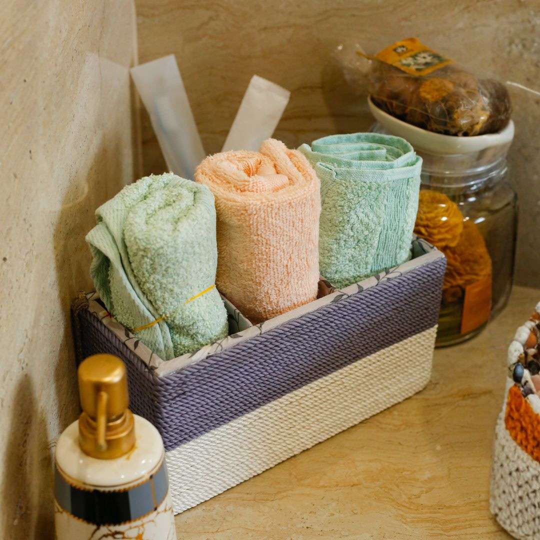 With its compact 10 x 4 x 5 inch size, it is ideal for neatly storing rolled towels, face cloths, napkins, toiletries, or grooming essentials. The sturdy rectangular form allows it to sit perfectly on bathroom counters, shelves, or inside cabinets.